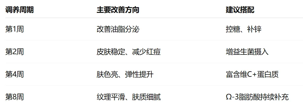 很多人仅仅依靠护肤品来修补皮肤表层,却未注意到“皮肤营养供应链”,皮肤细胞更新周期约为28天,这意味着,四周后你当下所吃之物会在你的脸上呈现,所以想真正改变肤质,请记住这张时间轴