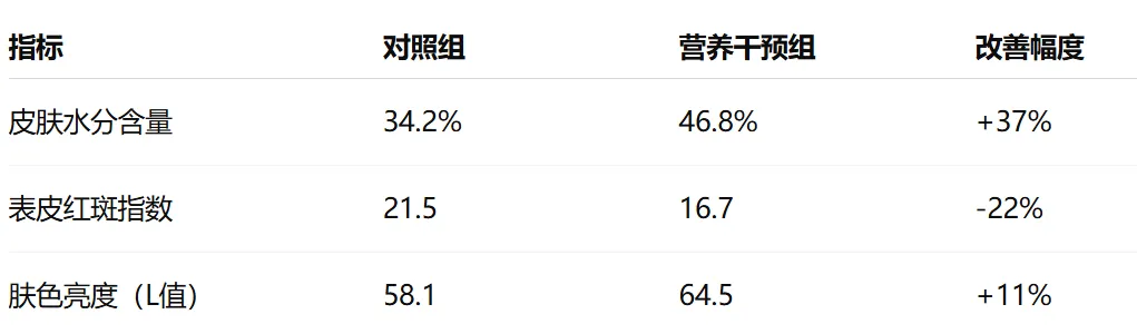 研究发现,持续8周的营养干预,可显著使皮肤含水量增多、炎症减少,且能让光泽度提升,