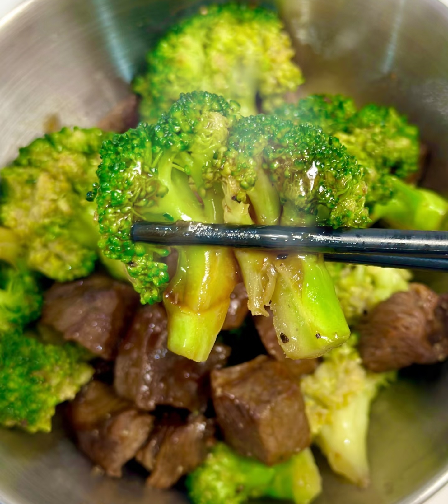 ④ 合炒收汁:西兰花回锅,牛肉粒返场,沿锅边淋 2 勺清水(或高汤),让蒸汽把味道“怼”进菜里。转中火,抖锅 30 秒,勾一点点薄芡(淀粉 ½ 勺+水 2 勺),汤汁裹匀就关火。