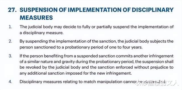 该媒体表示,国际足联纪律准则中明确写出了,禁赛缓期执行确实有依据,在国际足联纪律条例第27条中写的清清楚楚,纪律机构可以决定全部或部分缓期执行纪律处分,同时宣告缓期执行处罚时应设置一至四年的缓期执行考验期,而一旦被处罚人在考验期内再度出现同样或者更严重的违法行为,那么这个缓期执行将会被撤回,且并不影响新的违规行为追罚。