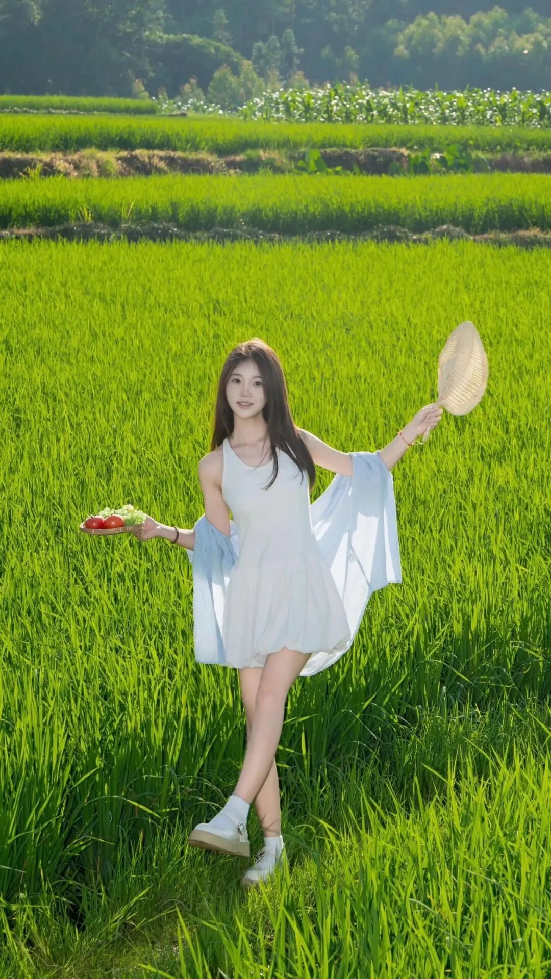 有时候,背影比正脸更有故事感。以背影面向镜头,一只手轻摇蒲扇,另一只手托着果盘,身体自然迈步,仿佛正走向稻田深处;长发与浅蓝色外搭随动作轻扬,定格田园漫步的悠然洒脱,给人无尽想象空间,仿佛下一秒就能踏入绿意梦境。