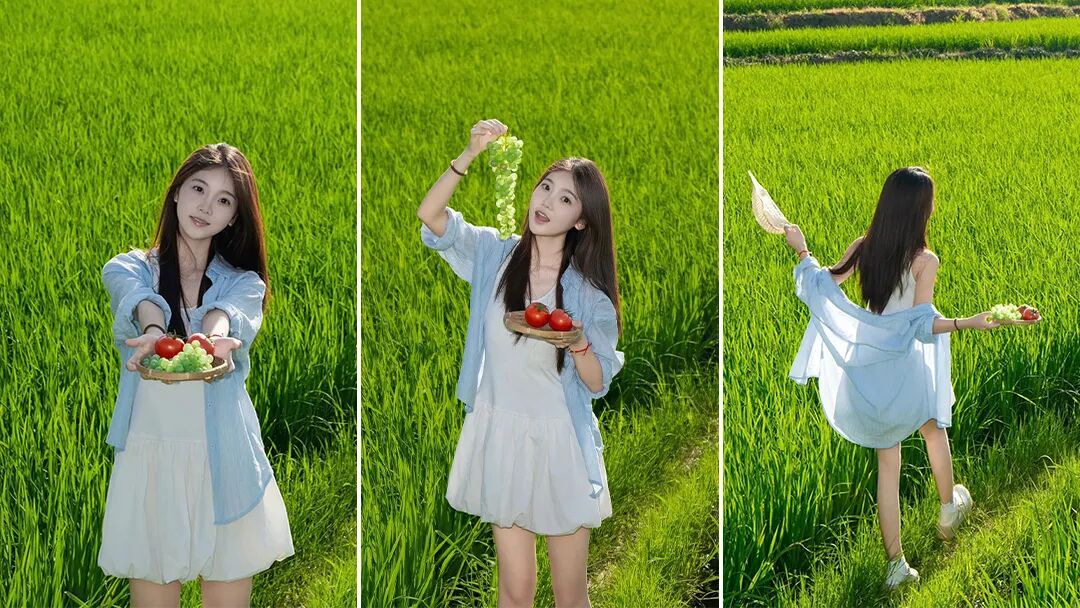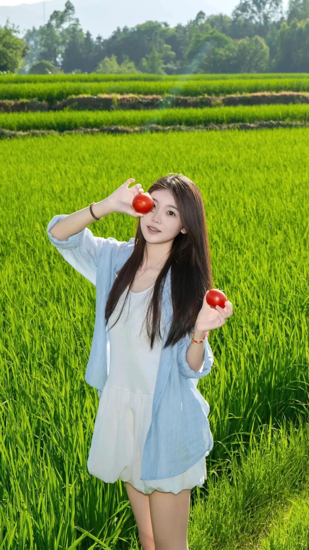 半蹲姿态,能更贴近稻田生机。如图半蹲,一只手将番茄向镜头远远伸展,仿佛要递到你面前;另一只手捧番茄靠近面部,“一远一近”拉伸画面维度,蹲姿的松弛感也让田园氛围更浓郁,互动感直接拉满。