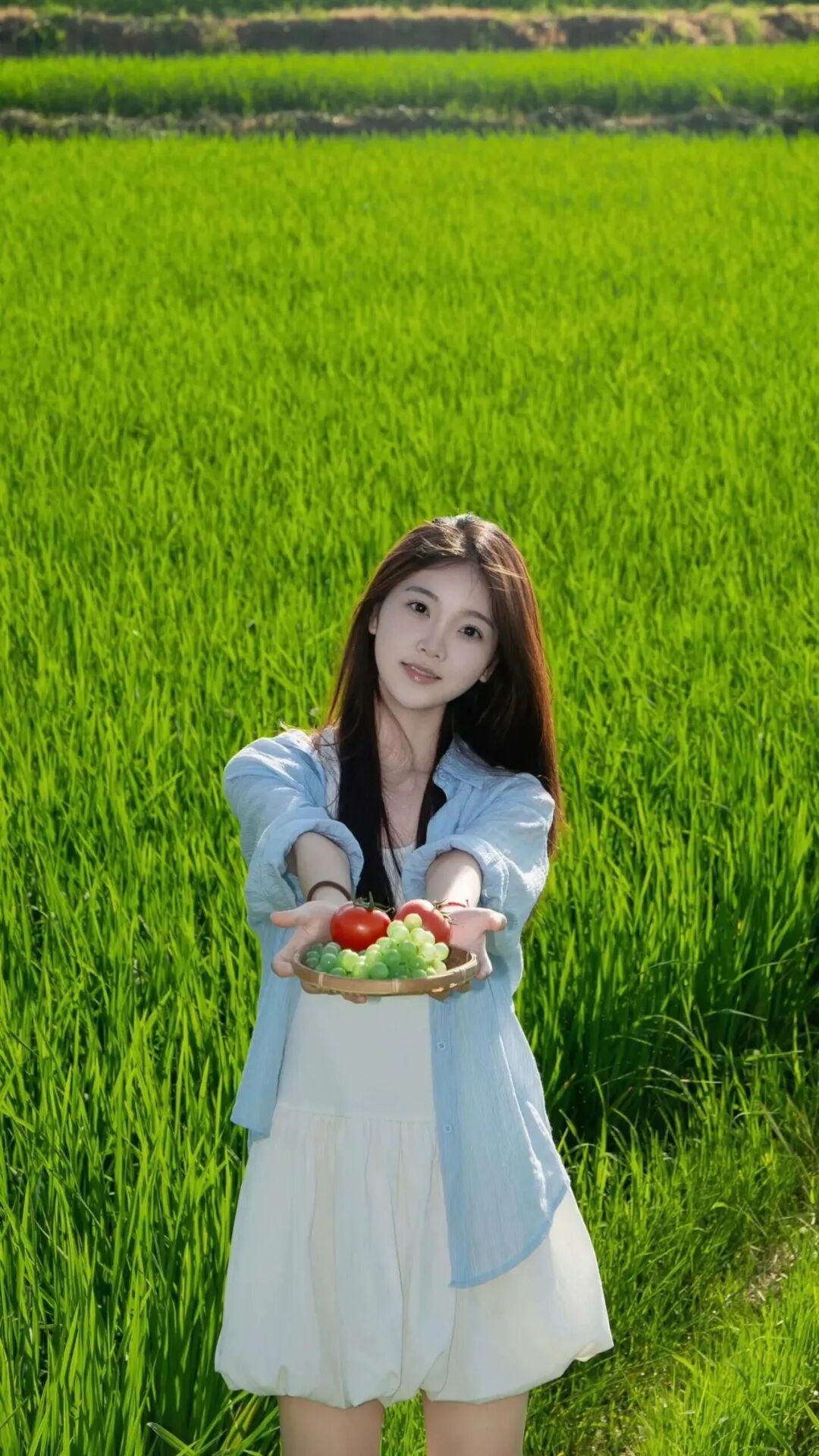 想让照片传递质朴温度?“真诚递送”很合适!将装着番茄、葡萄的果盘用双手向前递出,仿佛在热情分享田园馈赠;身体直立,眼神温和看镜头,浅蓝色外搭自然垂落,“递送”动作瞬间拉近与观者的距离,把田园的真诚美好直抵人心。