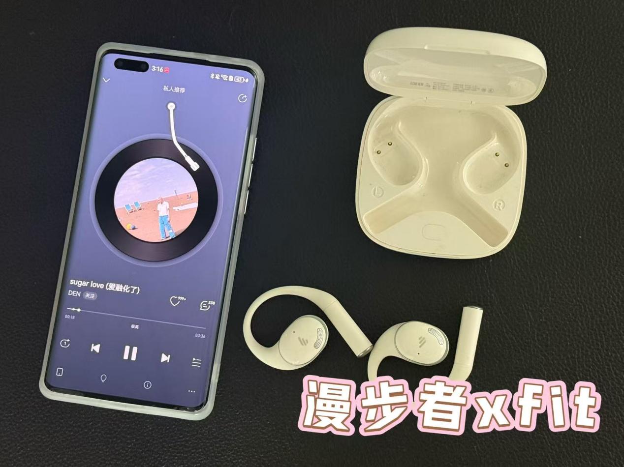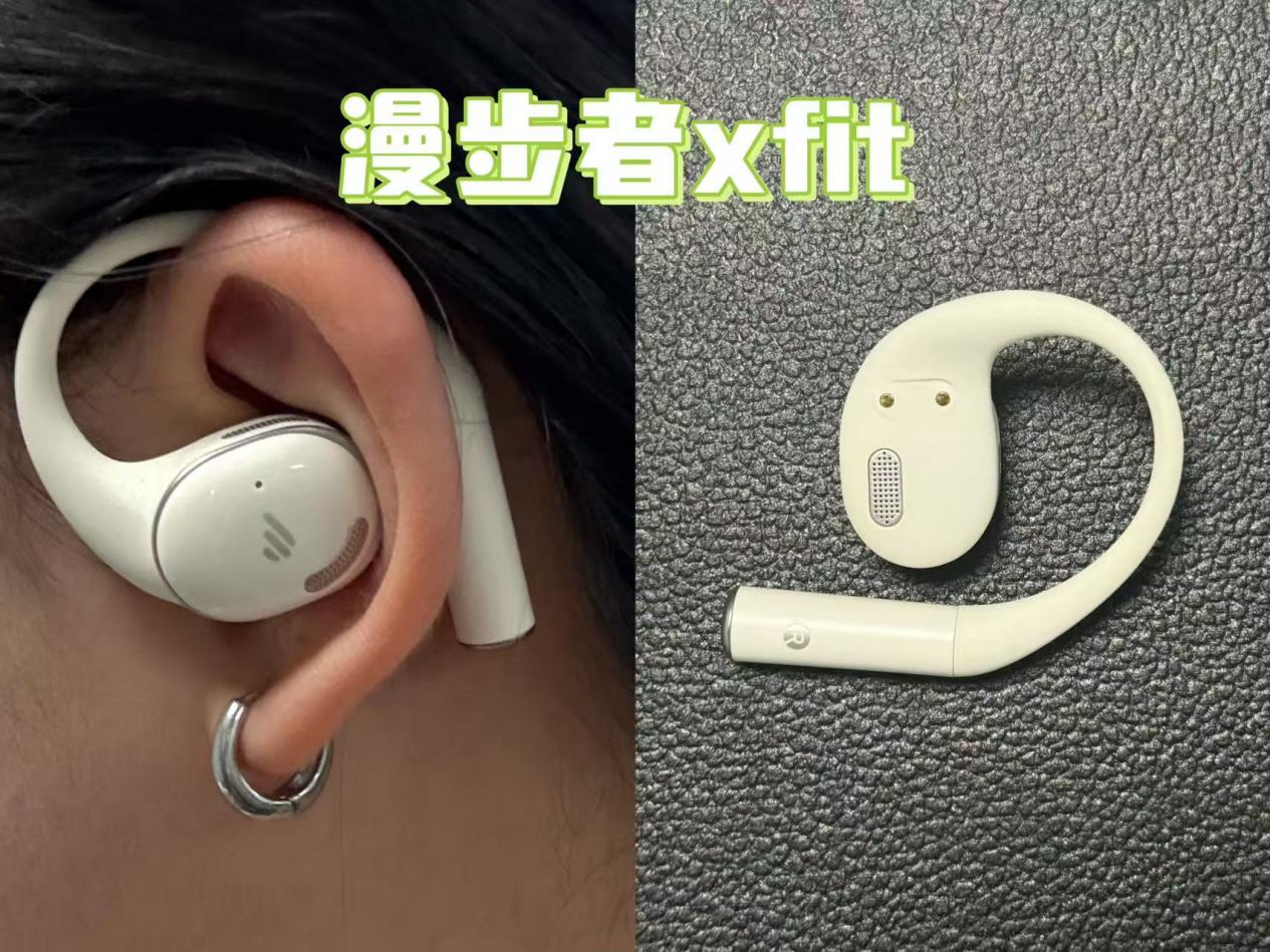 2.漫步者Xfit:使用了液态硅胶的材质以及镍钛合金丝高弹记忆耳挂设计,虽然轻,但对耳型有点挑,我闺蜜戴就觉得刚好,我戴了就很大,真的不适合小耳人群。
