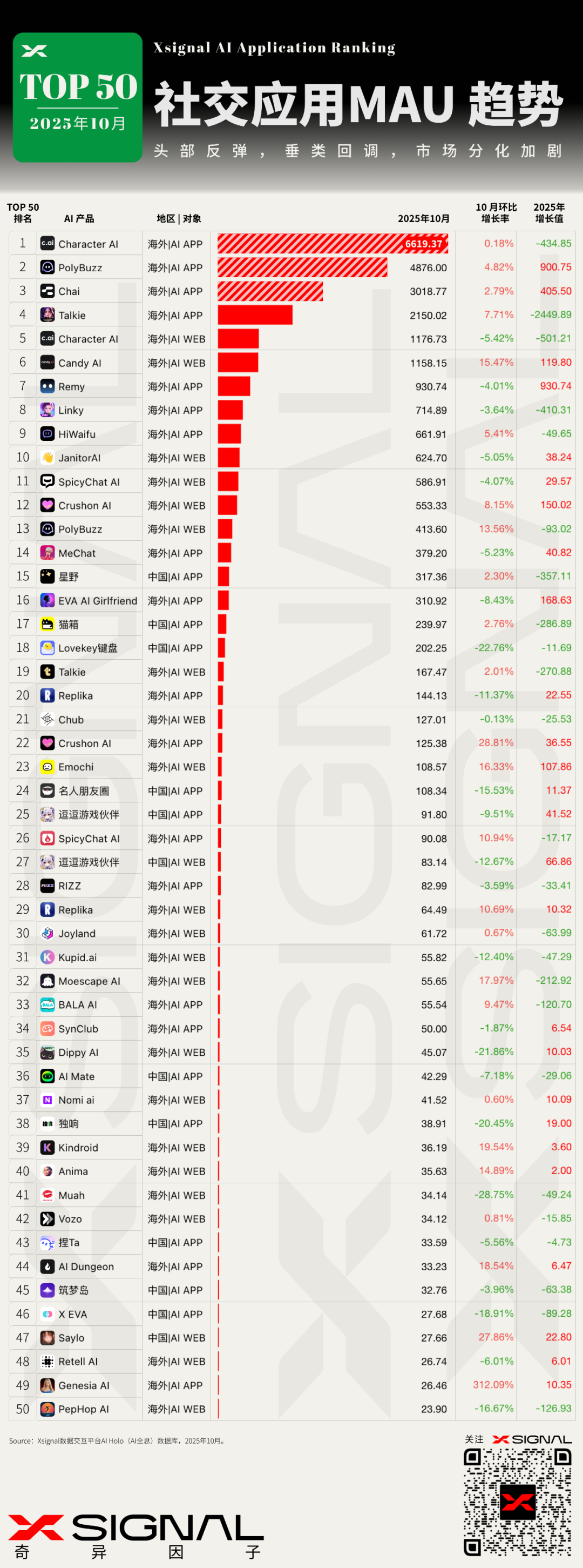 T全球AI社交行业及TOP50应用MAU趋势