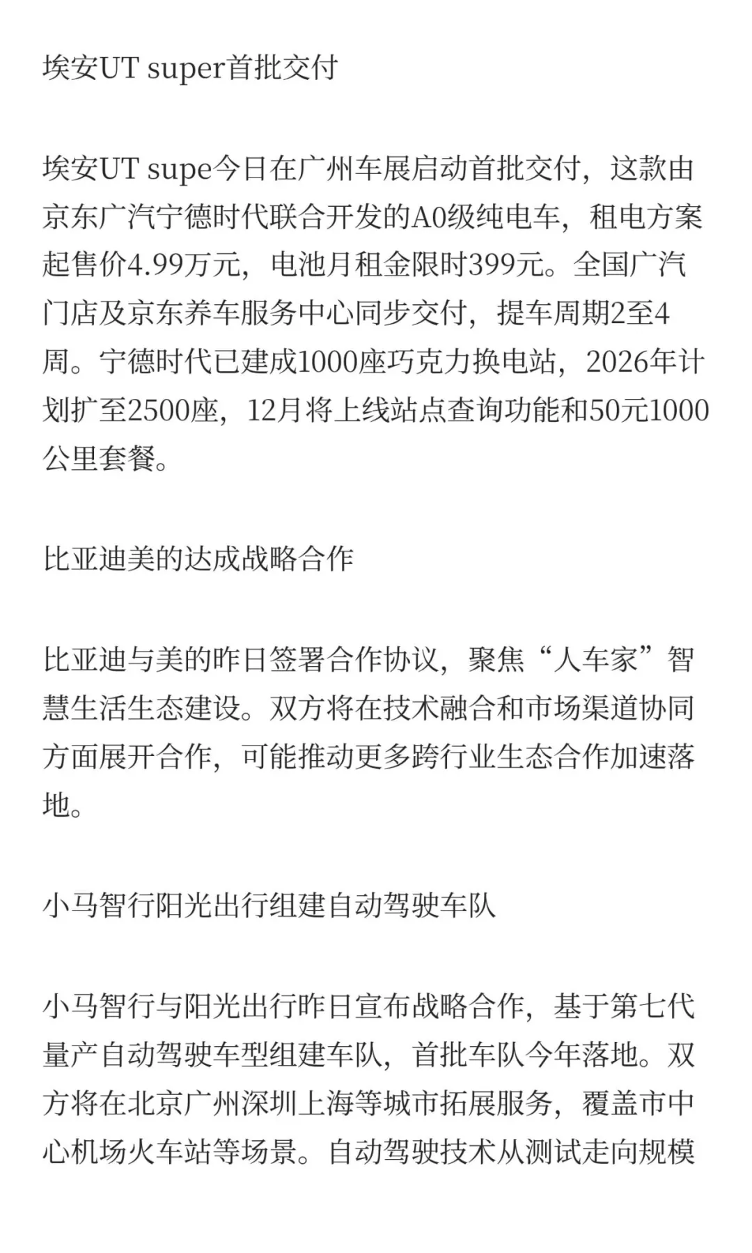 埃安UT supe今日在广州车展启动首批交付,这款由京东广汽宁德时代联合开发的A0级纯电车,租电方案起售价4.99万元,电池月租金限时399元。全国广汽门店及京东养车服务中心同步交付,提车周期2至4周。宁德时代已建成1000座巧克力换电站,2026年计划扩至2500座,12月将上线站点查询功能和50元1000公里套餐。