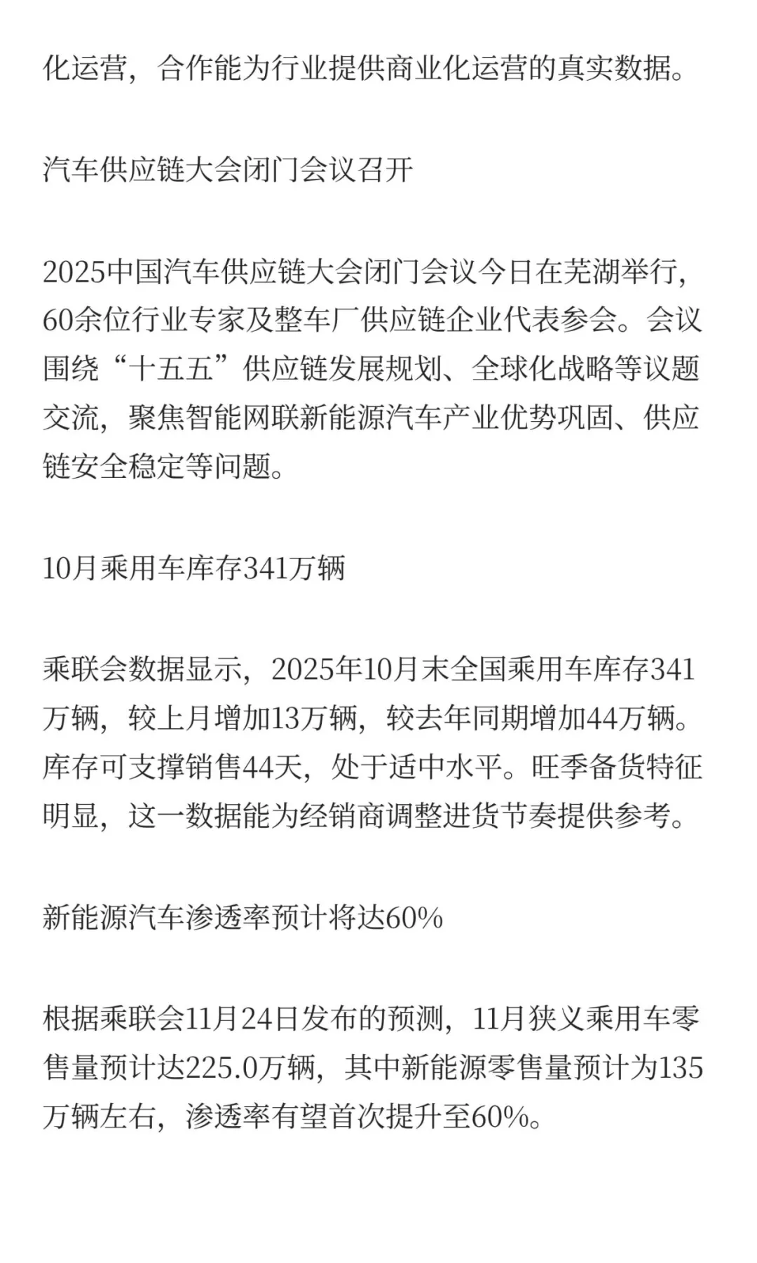 乘联会数据显示,2025年10月末全国乘用车库存341万辆,较上月增加13万辆,较去年同期增加44万辆。库存可支撑销售44天,处于适中水平。旺季备货特征明显,这一数据能为经销商调整进货节奏提供参考。
