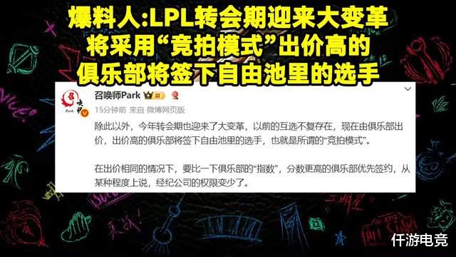 现在LPL网络上有爆料人透露,说今年LPL转会期迎来了一个大变革,那就是之前的互选模式不复存在了,取而代之的则是“竞拍模式”。这个“竞拍模式”就是说战队俱乐部出价,价高者得,得到的是将签约自由池里的电竞选手。如果竞价相同,则要比战队俱乐部的指数,指数高者优先签约选手。