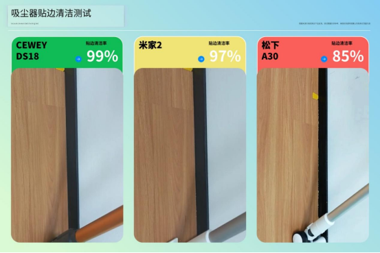 测试总结:贴边清洁优秀:CEWEY DS18贴边清洁良好:米家2显尘版贴边清洁一般:松下A30在这项测试中,CEWEY DS18凭借吸头前端窄边距设计和高贴合度,在一次推扫后墙边猫砂几乎全部吸入,边角残留极少,表现稳定。米家2显尘版的贴边清洁能力整体不错,但在个别墙角位置仍有少量猫砂残留,还要回头再扫几次。松下在贴边表现相对一般,吸头与墙面的间隙较大,导致猫砂颗粒容易留在边缘,需要多次回头扫才能清理干净。