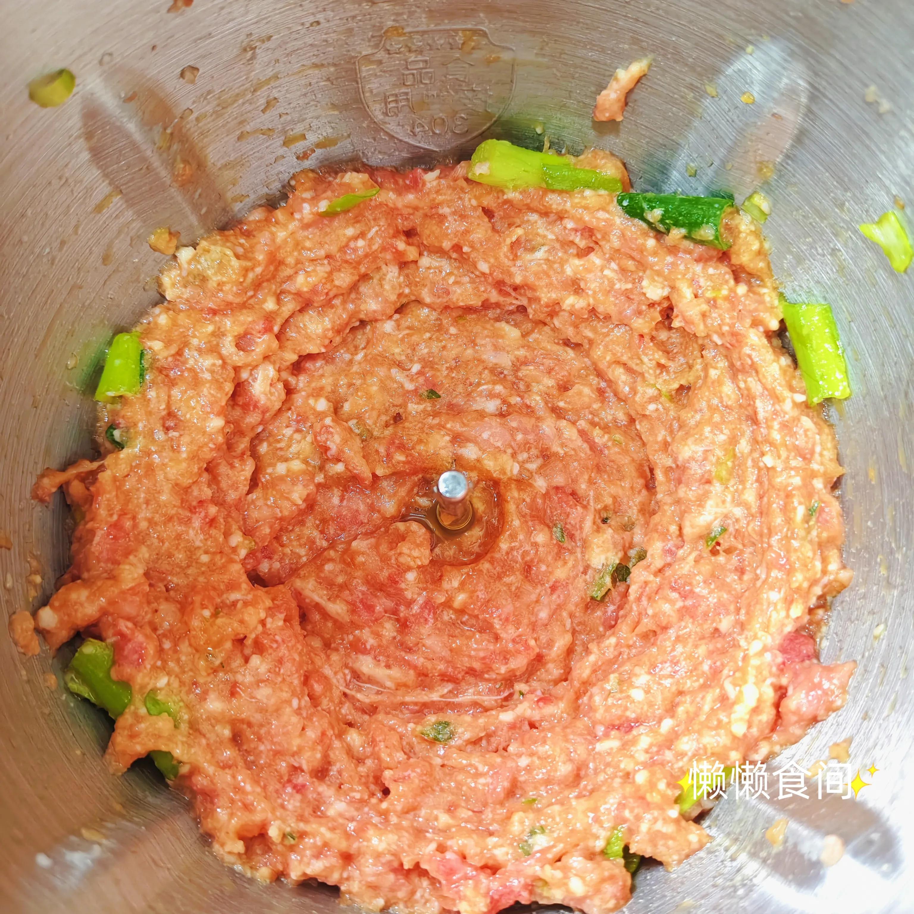 1、将肉切成块放入绞肉机中搅成肉末,加入葱花、盐、味极鲜、鸡蛋、胡椒粉,再次搅拌。