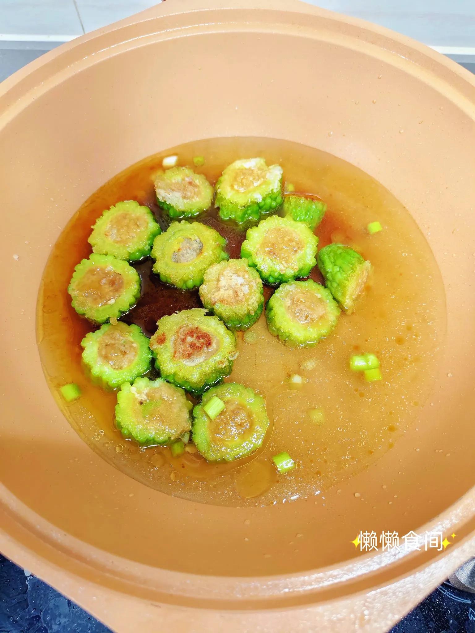 6、将苦瓜翻面,再次炖煮三四分钟。