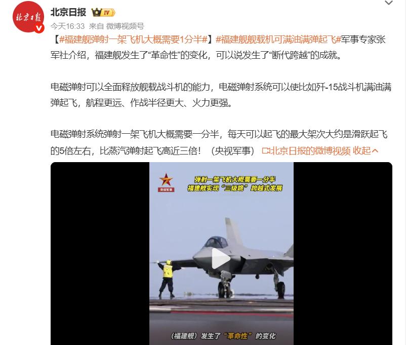 先来看一下一分半(90秒)弹射一架舰载机是个什么概念,这里指的应该是福建号航空母舰的最快弹射速度,电磁弹射系统的优势之一就是能够始终以最快速度弹射舰载机,这一点蒸汽弹射器就比不了,因为蒸汽弹射器运作时会消耗大量的蒸汽,快速弹射几架舰载机后由于航母蒸汽压力下降,就不得不降低弹射速度,待蒸汽压力提升上来后再弹射,而电磁弹射器由于不需要考虑蒸汽压力的问题,再加上全电推进的设计让福建号可以提供充足的电能支撑弹射器的持续运作,所以福建号能够始终以90秒一架的速度弹射舰载机,这个速度既是福建号的最快弹射速度,也是福建号的平均弹射速度。