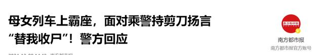 南方都市报在 2024-12-09关于《母女列车上霸座,面对乘警持剪刀扬言“替我收尸”!警方回应》的报道