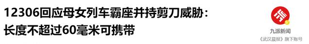 九派新闻在 2024-12-09关于《12306回应母女列车霸座并持剪刀威胁:长度不超过60毫米可携带》的报道