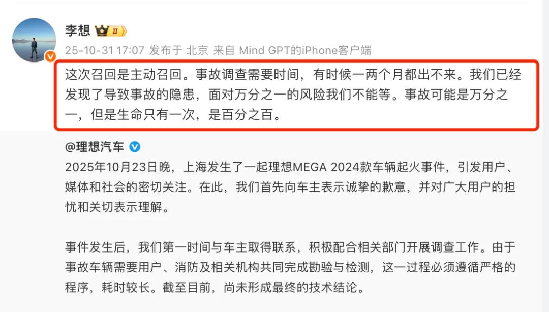 李想象征性地转发了理想汽车的声明,并平和地发表评论说:这次召回是主动召回。事故调查需要时间,有时候一两个月都出不来。我们已经发现了导致事故的隐患,面对万分之一的风险我们不能等。事故可能是万分之一,但是生命只有一次,是百分之百。
