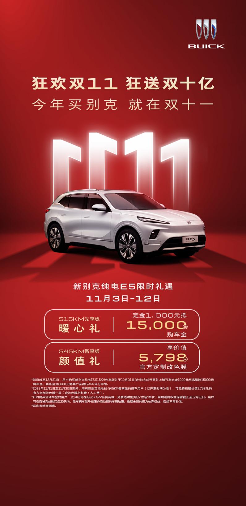 2025年11月3日 上汽通用别克正式启动“狂欢双11,狂送双十亿”限时大促活动。即日起至11月12日,昂科威Plus、昂科威S、君越、君威、别克E5等主力车型福利加码,结合多项购车礼遇,为消费者提供“无套路、真让利”的年内购车最佳机会。 —— 今年买别克,就选双十一!