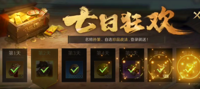 游戏还有七日狂欢活动,次日就送橙将孙策和自选战法包。孙策可是三国时期的名将,武力值和技能都非常出色,有了他的助力,新手玩家在战斗中能更加得心应手。自选战法包则让玩家可以根据自己的需求选择合适的战法,进一步提升武将的实力。好多新手玩家在拿到孙策和战法包后,都感觉自己的战斗力提升了一大截。