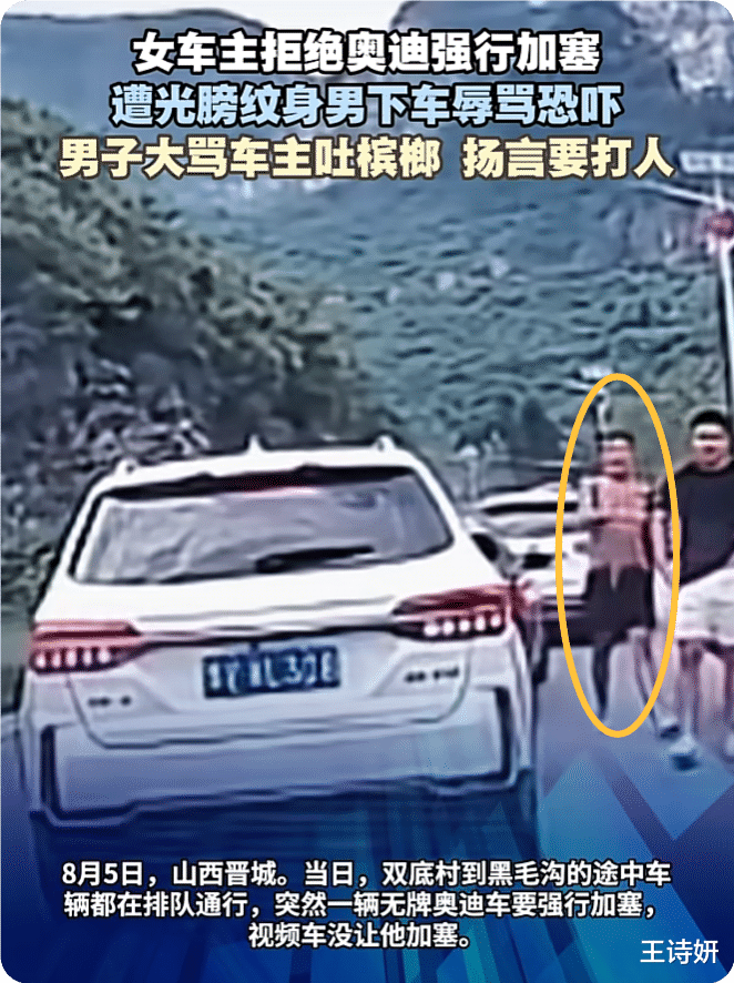 无牌照奥迪下来几名壮汉,其中光膀纹身男,嚼过槟榔砸向女子车上,破口大骂十几分钟,甚至想威胁她下车干架。