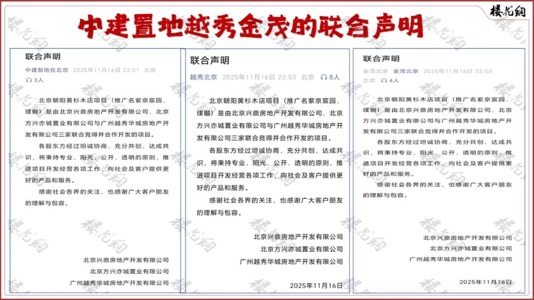 距离2025年11月17日零点10分钟,中建智地、越秀地产和中国金茂的北方区,同时发出联合声明,连标题共计233个字。