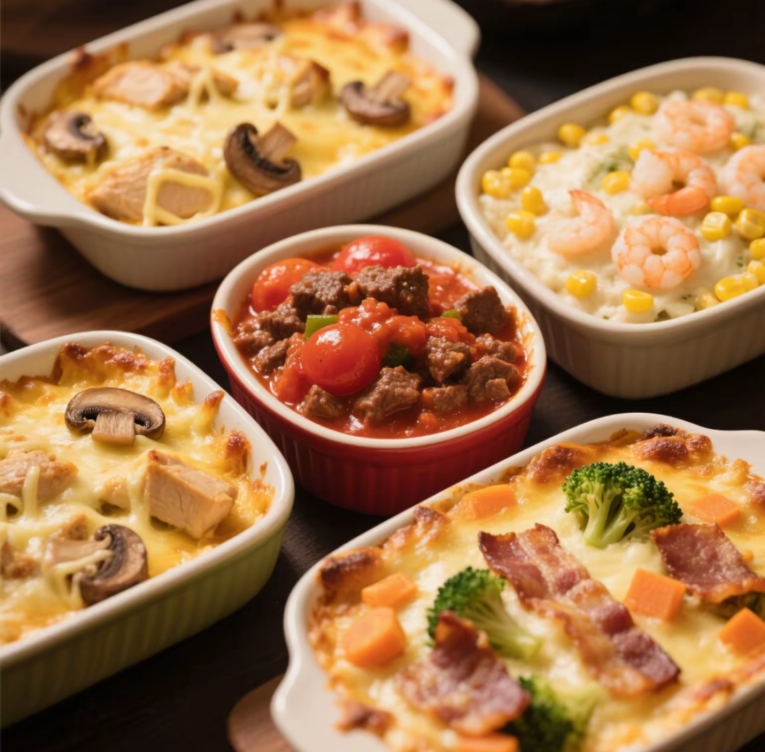 焗饭的灵魂在 “料” 和 “酱”。料得选能吸味的:海鲜焗饭用鲜虾、鱿鱼圈,先焯水去除腥味;牛肉焗饭用洋葱丝、彩椒丁,炒软更入味;蔬菜焗饭用口蘑、青豆,脆生生的解腻。
