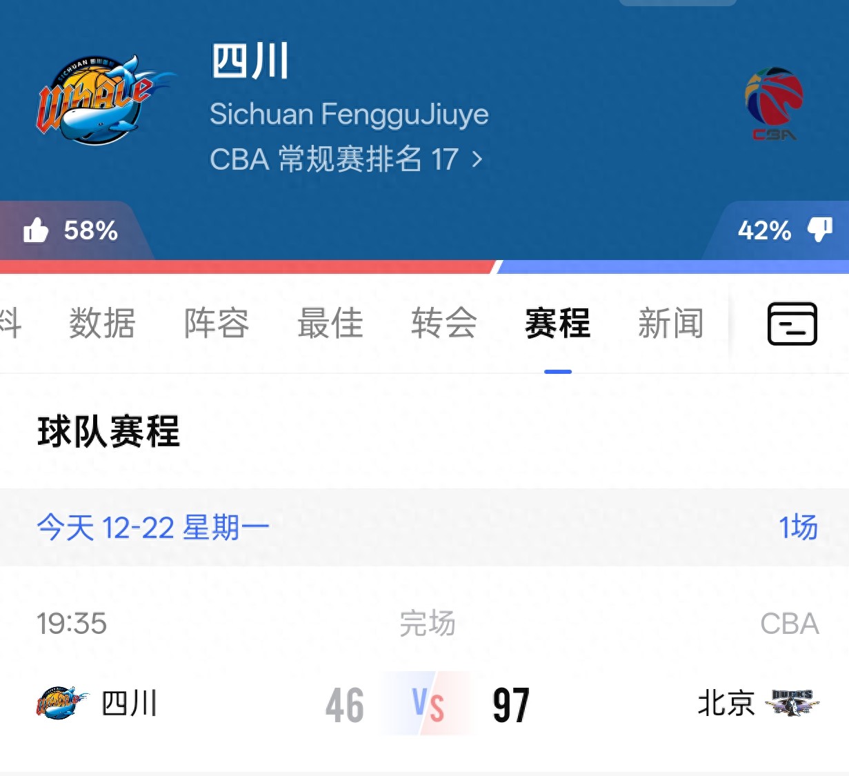 12月22日晚,CBA常规赛第20轮,四川男篮主场46-97输给北京男篮,吞下5连败。