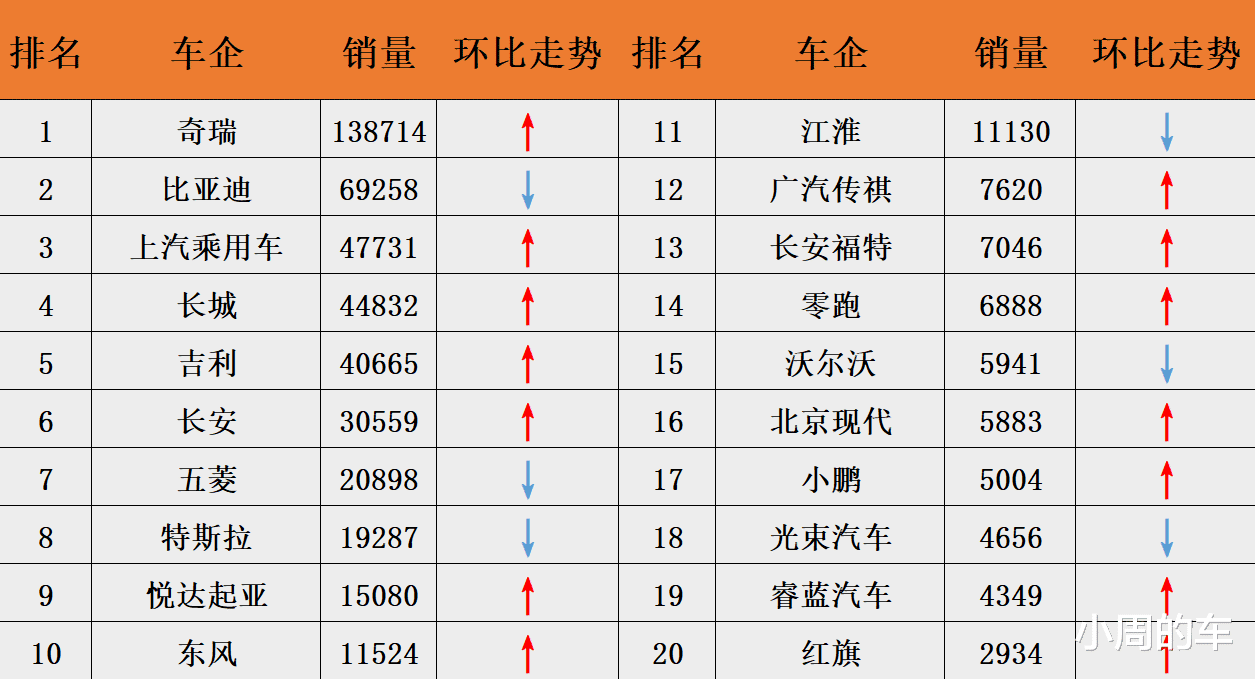 排名榜首的是奇瑞汽车,单月出口量达到了138714辆,环比增长9.4%,同比增长27.7%,是仅有的月出口量超10万辆的车企品牌。