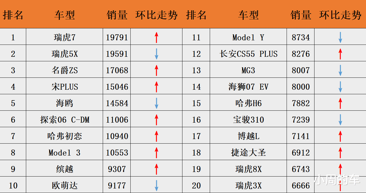 探索06 C-DM以11006辆的出口表现排在了榜单第六的位置;欧萌达单月出口量为9177辆,排名第十;此外,捷途大圣、瑞虎8以及瑞虎3X分列榜单的第十八至二十名,单月出口量分别为6912辆、6743辆和6666辆,以上车型,除了瑞虎5X和欧萌达的月出口量环比小幅下滑外,其他车型环比均实现了两位数的增长。