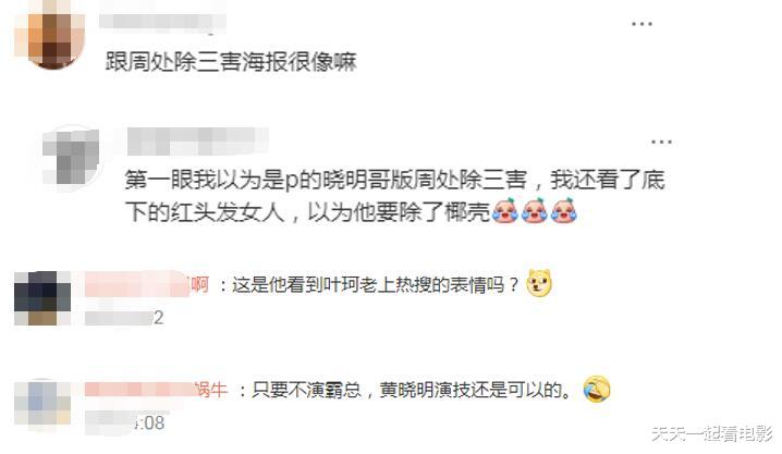 比起影片,网友讨论更多的是影片的海报,有网友就直接开喷表示,海报设计抄袭呀。还有网友表示,海报太像黄晓明版的《周处除三害》了。还有网友吐槽海报里黄晓明的表情,这是他看到叶珂老上热搜的表情吗?还有网友直言,只要不演霸总,黄晓明演技还是可以的。