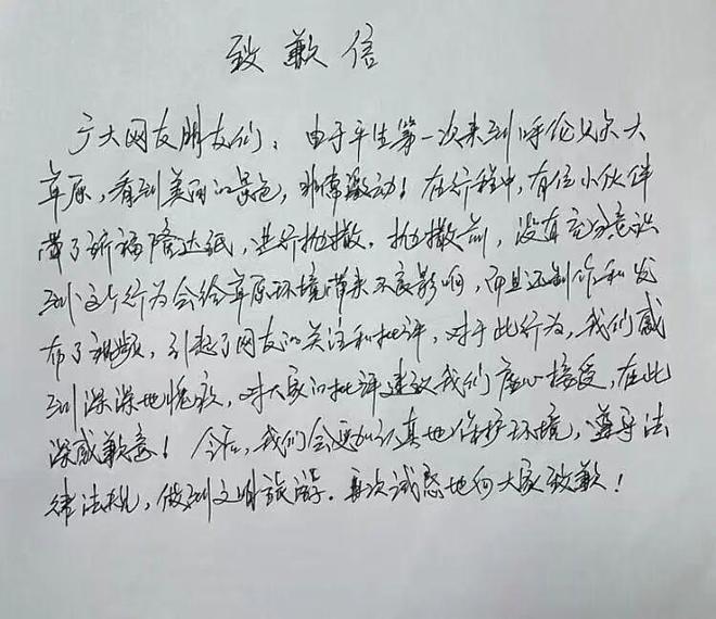 这封手写的致歉信称,由于平生第一次来到呼伦贝尔大草原,看到美丽的景色非常激动:“在行程中,有位小伙伴带了祈福隆达纸进行抛撒,抛撒前没有充分意识到这个行为会给草原环境带来不良影响,而且还制作和发布了视频,引起网友的关注和批评。”