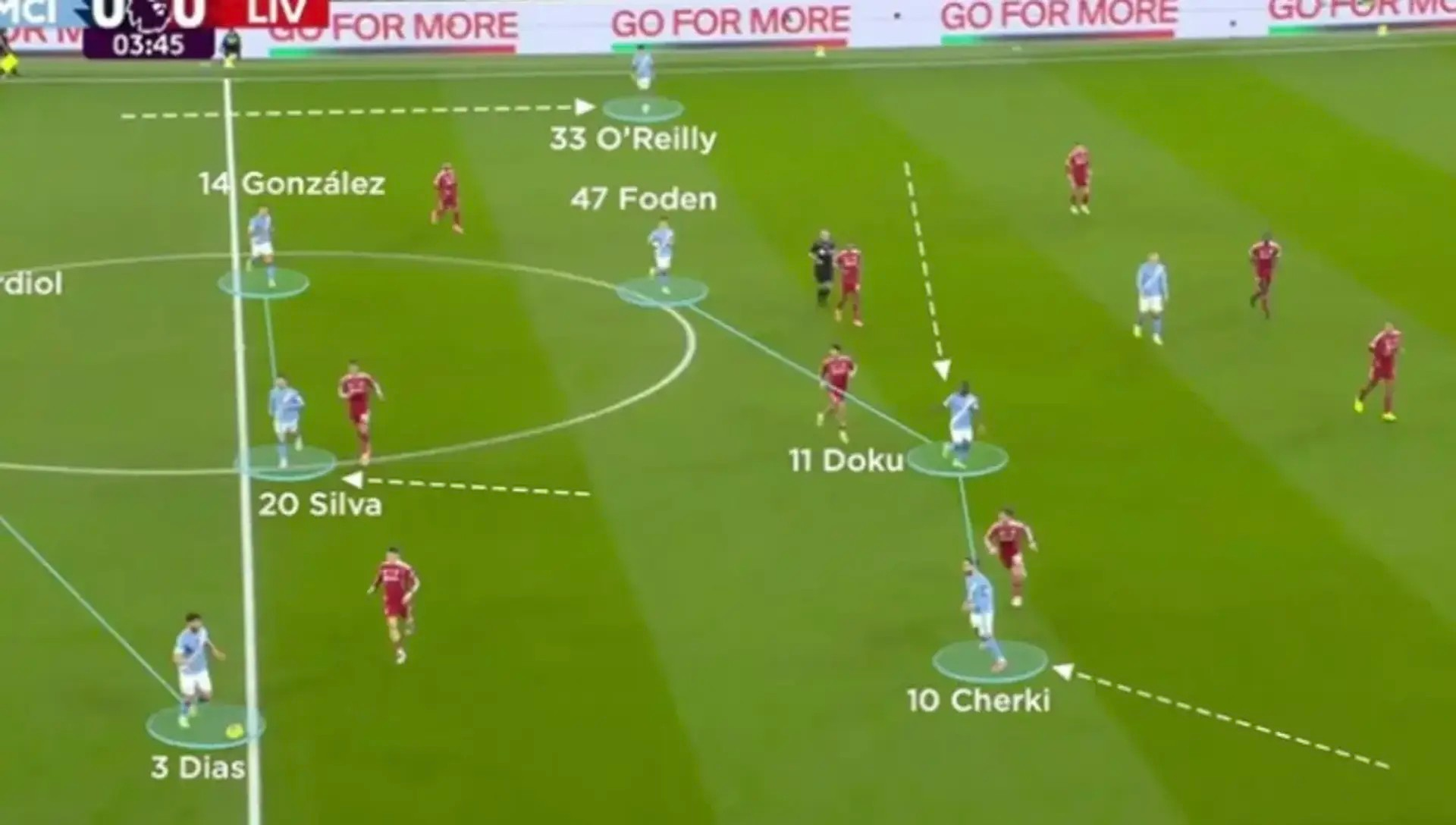 3-0大胜利物浦的比赛,让曼城重新跻身阿森纳的争冠对手行列,也完美展现了这套新战术。表面上他们沿用4-3-3阵型:哈兰德居中,切尔基与多库分居两翼,但这只是战术起点。努内斯和奥莱利两名边后卫大举压上——这部分仍延续着曼城的传统风格。