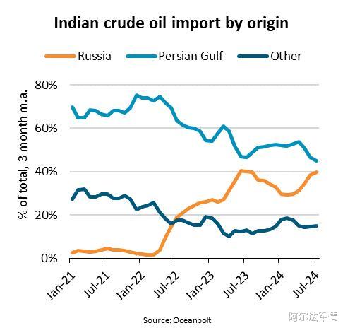 (2024年俄罗斯石油占印度全部石油进口量的约36%)
