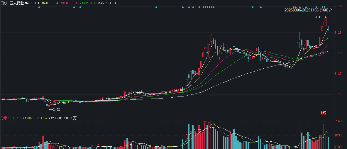 值得一提的是,亚太药业在宣布易主计划后复牌至今,股价累计涨幅已超过52%。截至11月6日收盘,亚太药业下跌1.26%报8.64元/股,最新市值为64.43亿元。