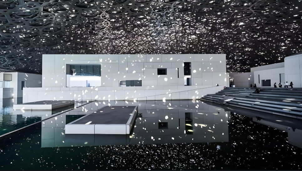 这座由普利兹克奖得主让·努维尔设计的建筑奇迹,最动人的时刻恰逢阿联酋罕见的雨季。7850颗金属星星构成的穹顶在雨幕中苏醒,雨滴与镂空金属碰撞产生的声波,在建筑内部形成独特的混响效果。中国战国青铜翼龙、古埃及法老金棺、波斯细密画等来自13个文明的文物,此刻都沐浴在变幻的光影里——阳光穿透雨帘,在展馆地面投射出流动的星图,仿佛为展品披上崭新的时空外衣。