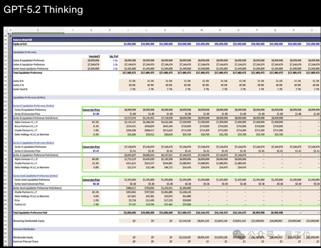 在投行分析师的电子表格建模任务上,GPT-5.2 Thinking平均每项任务得分相比GPT-5.1提升了9.3%,从59.1%上升到68.4%。这些任务包括为财富500强公司搭建三表联动模型、构建杠杆收购模型等。