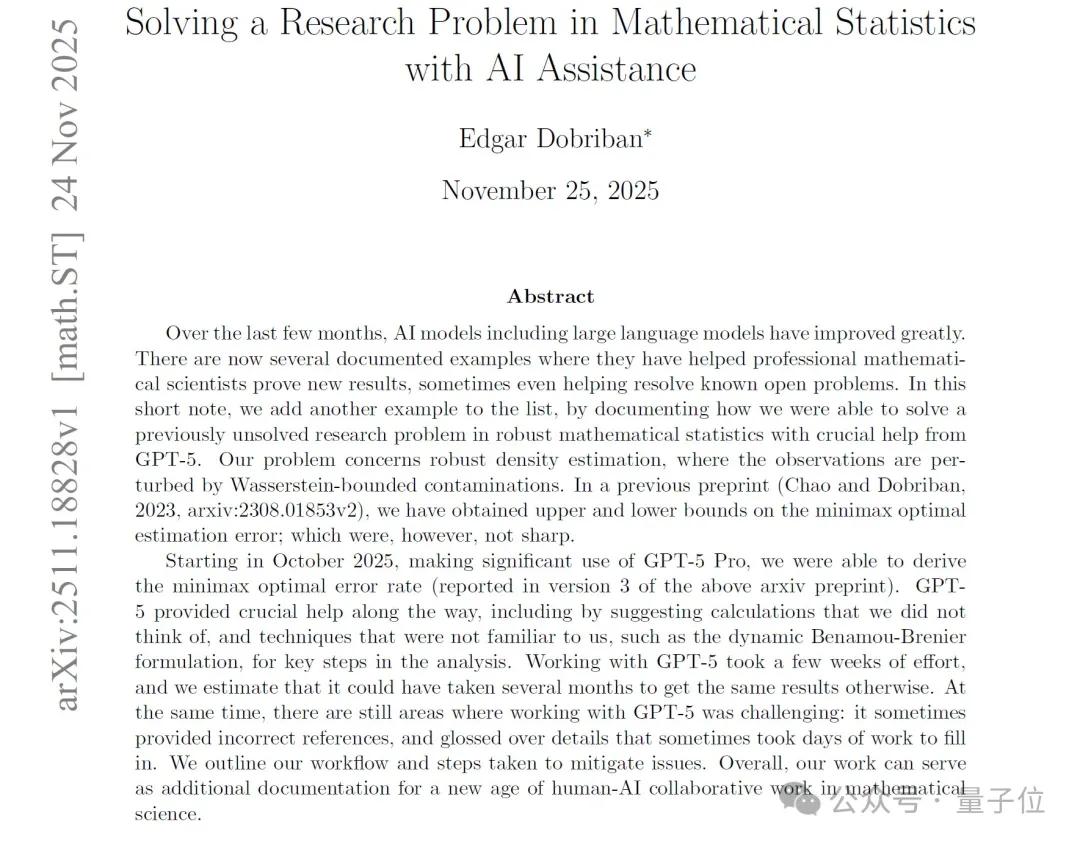 研究人员使用GPT-5.2 Pro探索了统计学习理论中的一个开放问题,在一个狭窄、明确的设定下,模型提出了一个证明,随后被作者验证并经过同行评审。