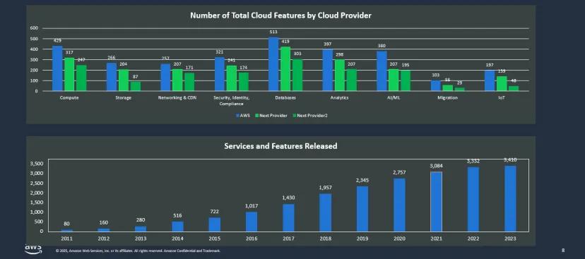 你能想象吗?在过去一年的时间里,亚马逊云科技竟然完成了多达3410次的服务发布和升级,不断扩展自身的服务矩阵,能够为客户提供2863项云服务及功能。无论是服务的深度还是速度,都遥遥领先于其他任何一家云服务商。