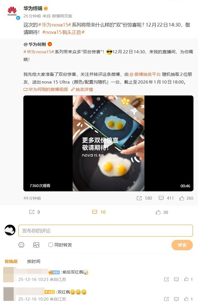 继 @华为终端 官宣了nova 15系列定档12月22日发布,仍将由 @TFBOYS-易烊千玺 作为全球代言人,以及包括标准版、Pro版、Ultra版三款机型的真机海报以及三款机型已经开启了预约等消息之后,日前,华为终端BG首席执行官 @华为何刚 还发布了该系列新机的预热视频,并透露,“#华为nova15#系列带来众多‘双份惊喜’!”,而据推测,该系列新机将配备前后双红枫镜头。