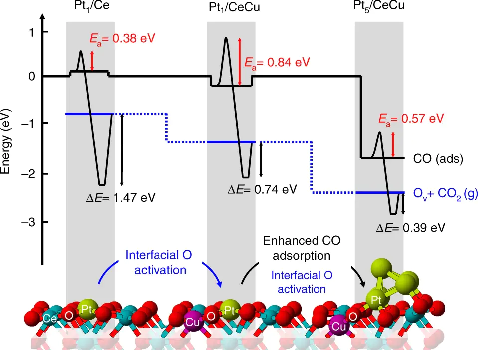 对于异相催化界面对反应物种、中间产物及产物的吸附脱附能会直接影响催化动力学进程。基于,技术可在催化剂界面构建原子级物质,通过界面优化调控催化剂对反应物、反应中间产物的吸附/脱附行为。如图3所示,研究人员合成了Cu修饰二氧化铈(CeO₂)负载的铂亚纳米团簇,该催化剂在一氧化碳氧化测试中表现出优异性能。