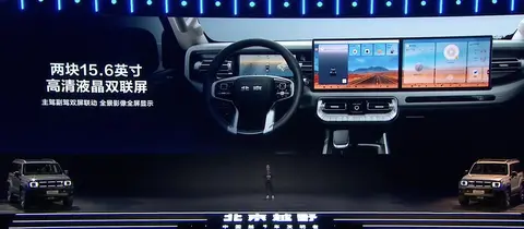 内饰也是接近现款,一切熟悉而稳妥。但俩15.6英寸大屏很吸睛,副驾一起联动,8155芯片+16GB运存+128GB存储空间,这些配置摆在20万价位算豪横了。各种人车交互、高德地图和CarPlay都上了,还塞进360度影像和全景天窗。一看就是在怼对手。