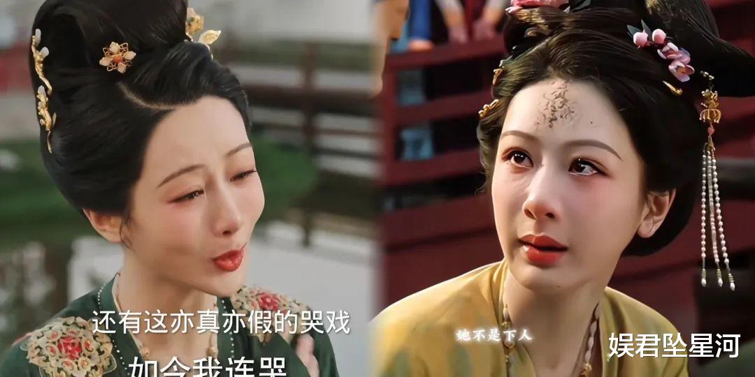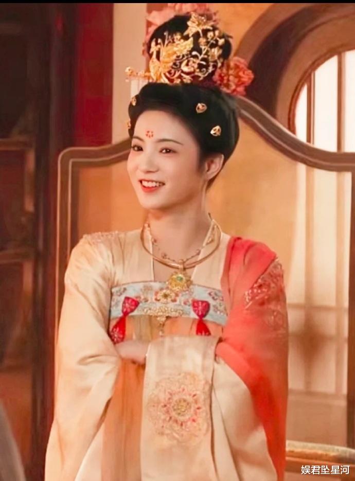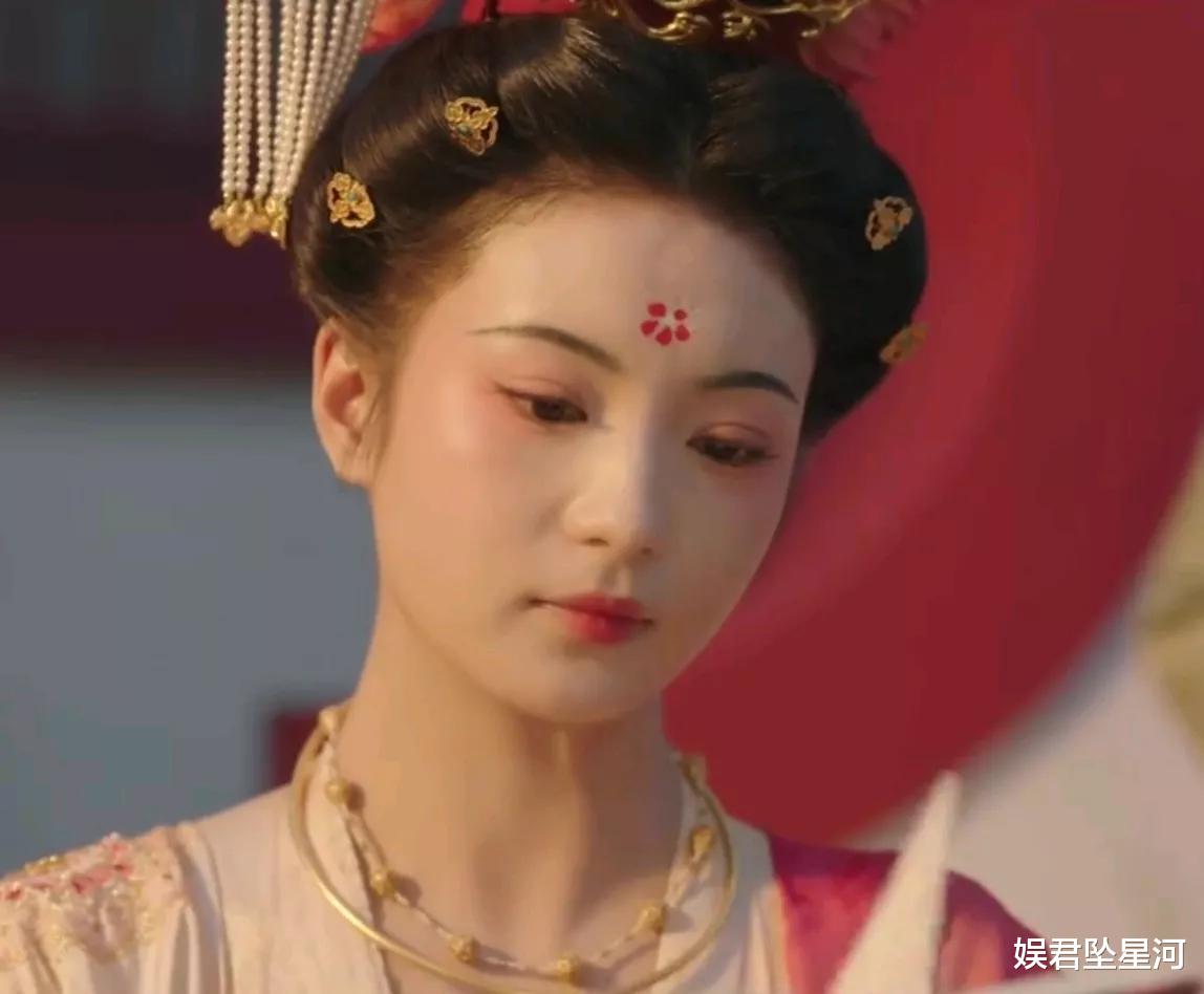 直到女二张雅钦扮演的县主登场,对比就更明显了。从马车上下来,仿佛是从仕女图的画中走出来的,圆嘟嘟的脸完全撑起了花团锦簇,金光闪闪的发饰。一整个端庄大气,雍容华贵,仿佛小时候看《西游记》女儿国国王登场一样,让人印象深刻。