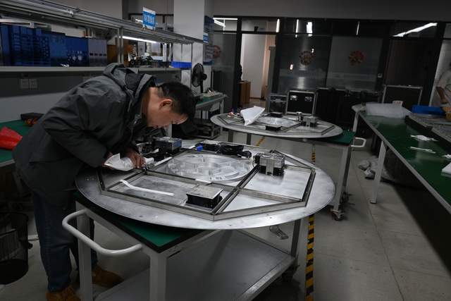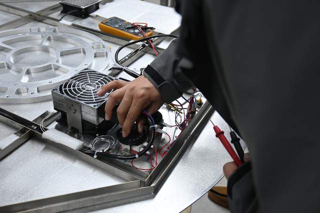 雷可达工作人员查看高低温雷达防护系统底部设备