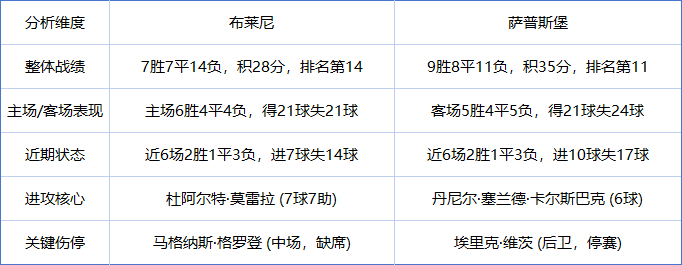 · 主场龙 vs 客场龙:布莱尼本赛季超过三分之二的积分来自主场,主场是他们的主要抢分阵地。而萨普斯堡则恰恰相反,他们客场的战绩(第5名)远好于主场(第14名),是一支典型的“客场龙”球队。这将是主场优势和客场韧性之间的直接对话。