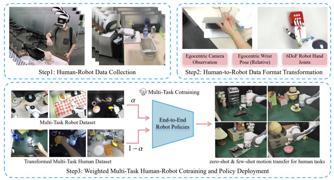 这一结果改变了人们对人类数据的认知 —— 它不再只是提升鲁棒性或加速收敛的 「调味剂」,而是足以独立充当「主菜」,让机器人直接习得陌生任务。框架本身简洁直白、模块化设计,采、转、训三步即插即用,未来面对更大规模的数据集或参数量级的模型,只需横向扩容即可适用。