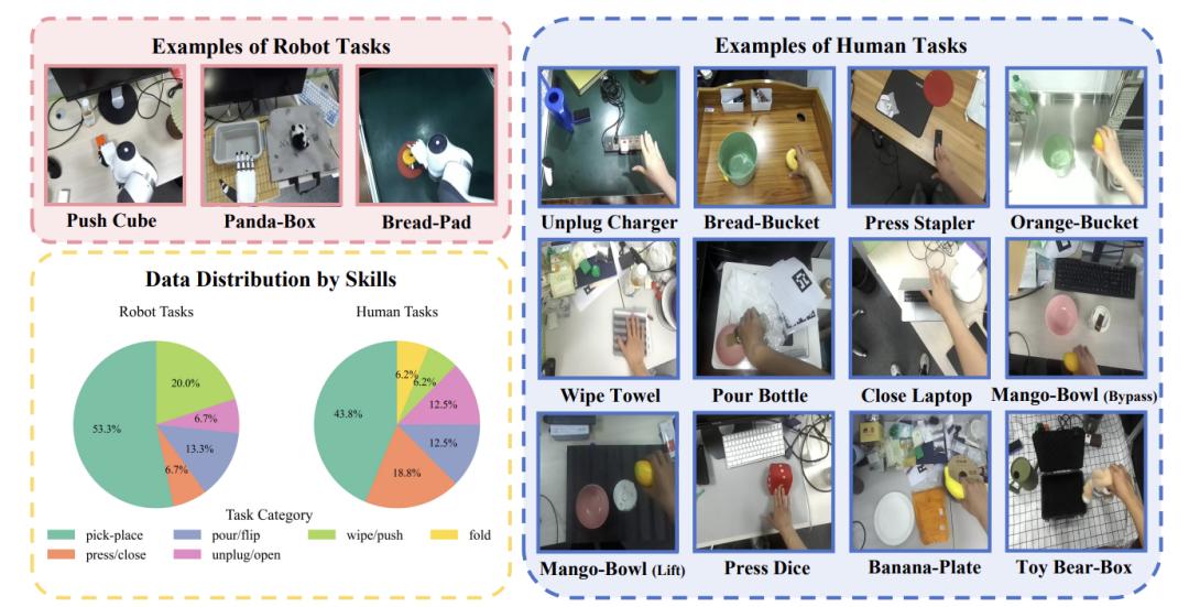 因此,团队选择了最为主流的 Diffusion Policy 和 VLA 模型来作为模型架构。最后,团队采集了一个大规模人类 - 机器人数据数据集,包含 3200 + 轨迹、15 个机器人任务、15 个 (与机器人任务不同的) 人类任务和超过 10 个真实生活场景。