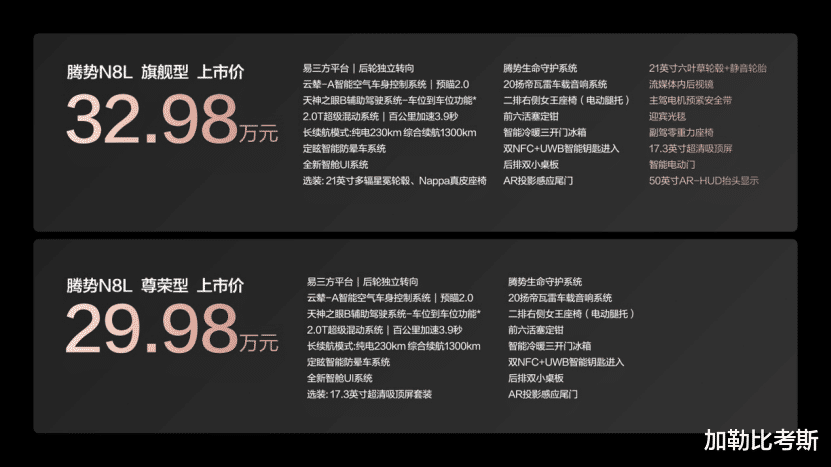 腾势 N8L 在10月28,也就是今晚刚公布的 29.98 万 - 32.98 万售价,在大六座 SUV 市场里算得上火爆性价比。对比同价位竞品,它最难得的是 “标配即高配”—— 易三方三电机系统、云辇 - A 空气悬架这些核心配置全系都有,不用为关键功能多掏几万块钱。