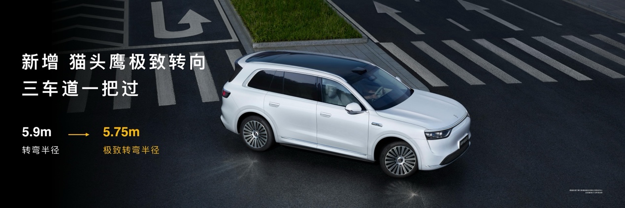 新增猫头鹰极致转向,极致转弯半径5.75m,三条车道一把过,让全尺寸SUV像轿车一样好开。新增横向风稳定控制,毫米级横向风识别,动态调整悬架硬度,自动校正行车方向,降低大风天气下行车风险。