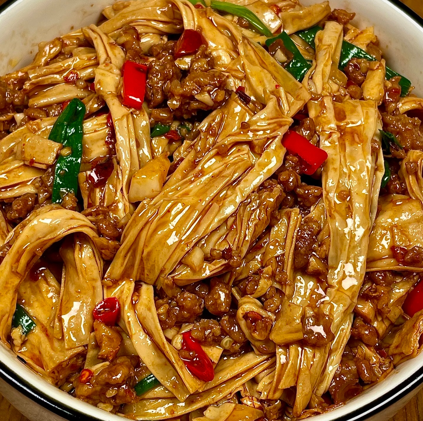 1. 肉末不打水:传统做法爱打水,让肉嫩,可豆皮吸水强,肉末一旦出水,豆皮就“泡汤”。改用“油润法”——靠猪板油自身油脂,肉末粒粒分明,豆皮干爽有嚼劲。