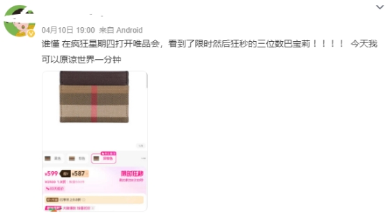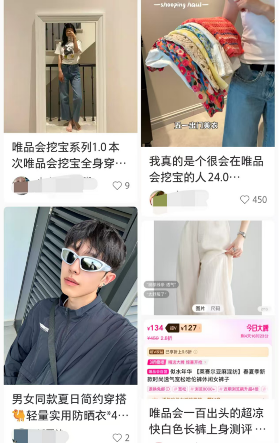 像之前唯品会巴宝莉的“限时秒杀”专场活动,Burberry MADISON通勤包低至2399元,只要专柜价的1.5折,还有专柜价1.8折的Burberry Mackford单肩包,多种奢侈包包开抢即秒空,连老婆这样的的资深铁粉都没有抢到,折扣火爆程度可想而知。在网上一搜唯品会,确实有很多人都在点赞分享唯品会的折扣特价服装,甚至戏称为“挖宝”。“唯品会挖宝系列1.0,本次挖到全身穿搭,短袖、牛仔裤、外套都有,很满意。”“个人在唯品会挖过好多次宝了,这次的好看又便宜,都是1-2折的牌子货。”