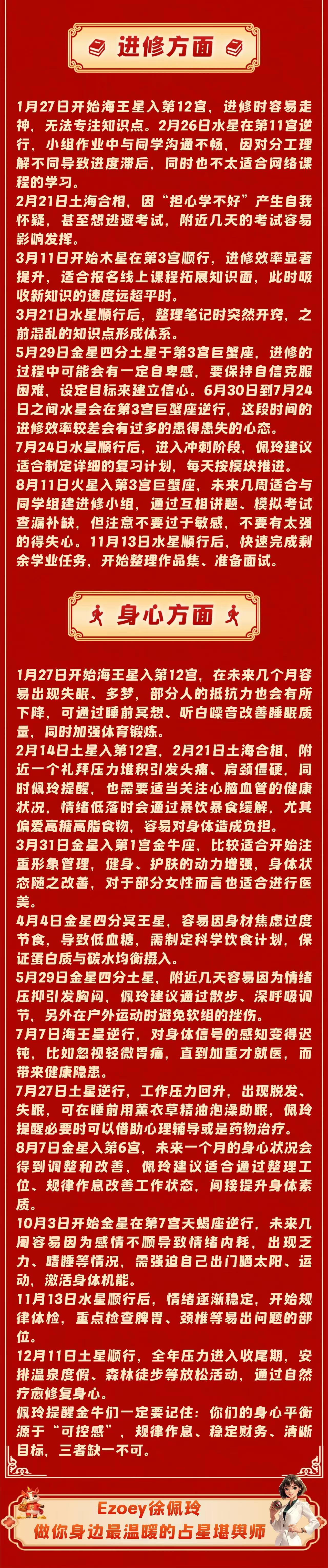 佩玲接下来会为金牛座26年在感情、事业、财务、进修、身心等领域全年标注,帮助大家把握先机。