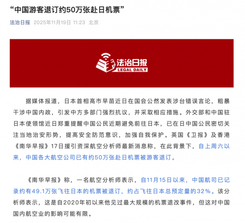 自官方提醒发布以来,中国游客大规模退订机票与酒店:有媒体统计自11月15日以来退订机票约达五十万张,多家航司已针对12月31日前的赴日客票推出免费退改政策,但酒店退订因受制于日方商家条款与供应商的合同关系,存在差异化处理。同时,网络出现代打日语电话的“代退”中介服务,称成功率并非100%,并收取服务费来协助争取退款。